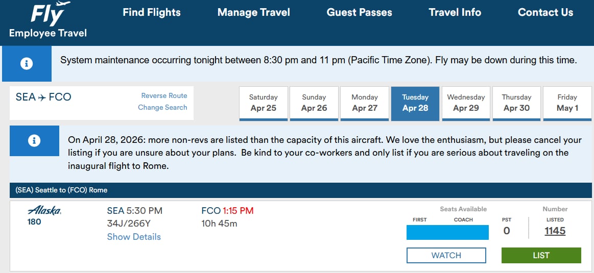 Several days ago I wrote that 526 people had waitlisted to get on the Alaska Airlines Seattle to Rome flight. This is generally going to be employees of Alaska, family members, and even employees of other airlines flying as non-revenue passengers.