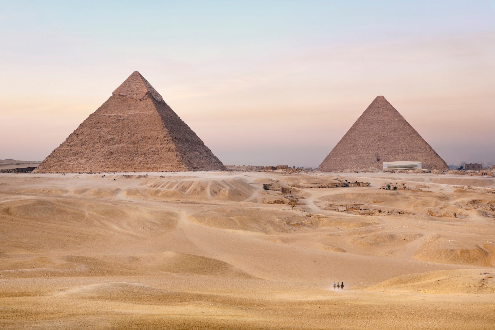 Cairo, Egypt, Africa. Pyramids of Giza. The Pyramid of Menkaure (Mycerinus) left and Pyramid of Khafre (Chephren) right. Twilight (twilite)