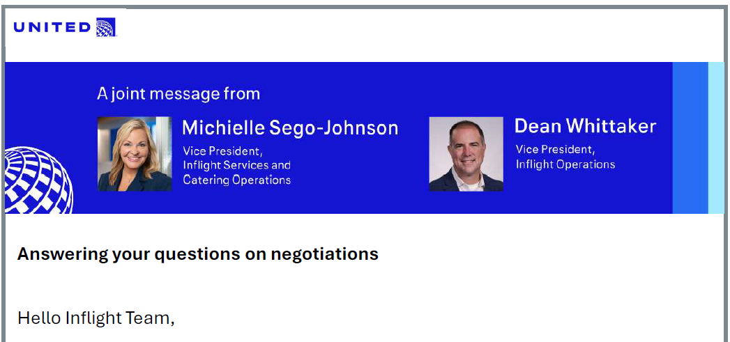 United has been updating flight attendants with its message directly, not just through the union. Last month they told flight attendants that pay for time spent waiting in the airport was on the table! But the total cost of the contact couldn’t really go up. They were already offering industry-leading pay, benefits and work rules. So they were going to have to offset the cost for this and other priorities that the union was now asking for in a new bite at a contract. And they suggested a couple of things were being negotiated: