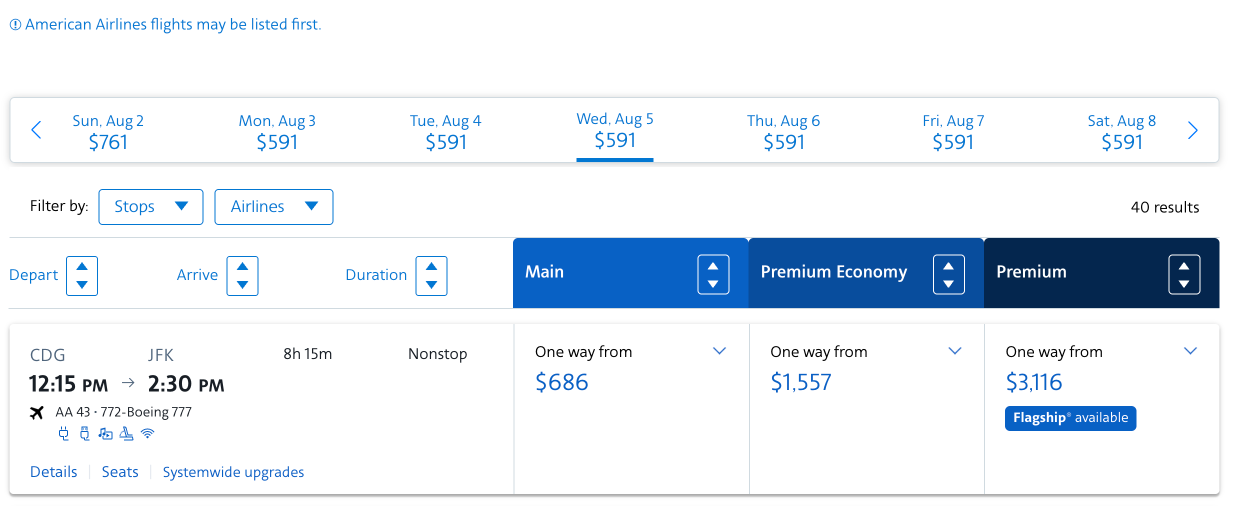 I have AAdvantage Executive Platinum status and a few expiring upgrade certificates. I needed to find a flight back from Europe in August.