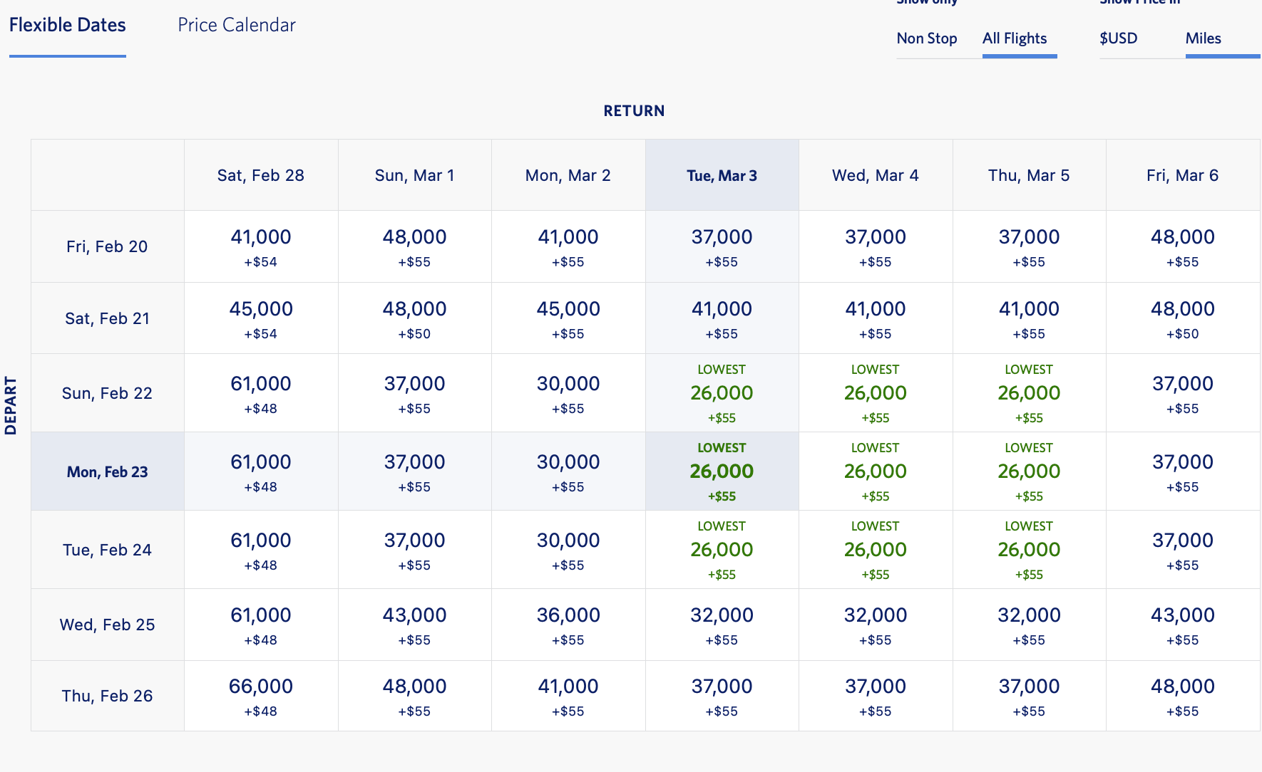I always like to point out in these deals that using Delta’s Price Calendar will save you considerable time when searching for the lowest fare. Once you log in to your Delta SkyMiles account on the Delta website, search for your desired flight, then click the “Price Calendar” tab. Here’s what we found for the lowest available awards from New York to Barcelona in late February/early March: