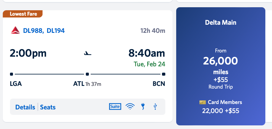 There is good availability to fly out of LaGuardia Airport (LGA) to Josep Tarradellas Barcelona-El Prat Airport (BCN) — with a brief layover at Hartsfield-Jackson Atlanta International Airport (ATL) — starting at 26,000 SkyMiles each way, plus $55 in taxes and fees. Booking the trip with a Delta cobranded American Express card saves an extra 4,000 miles.