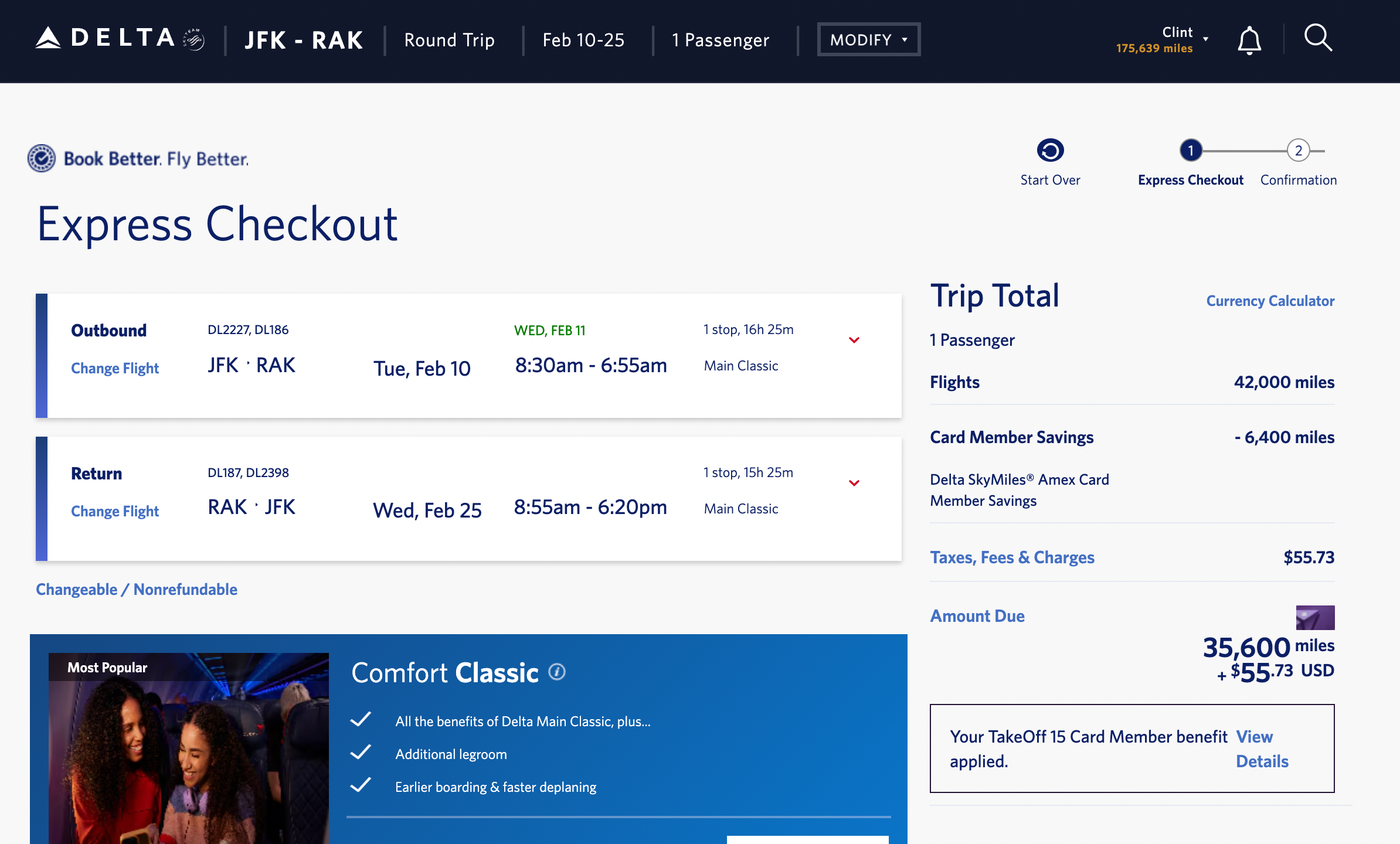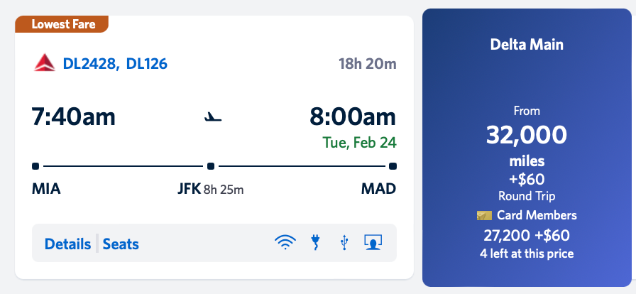 I always like to see if the latest sales involve flights out of Miami, since it’s my home base. The deals to Spain aren’t quite as good as the ones out of New York, but I did find flights out of Miami International Airport (MIA) to Adolfo Suárez Madrid-Barajas Airport (MAD) in February for 32,000 SkyMiles round-trip, plus $60 in taxes and fees. Using a Delta cobranded credit card saves you an additional 4,800 miles. This itinerary includes a layover at JFK each way.