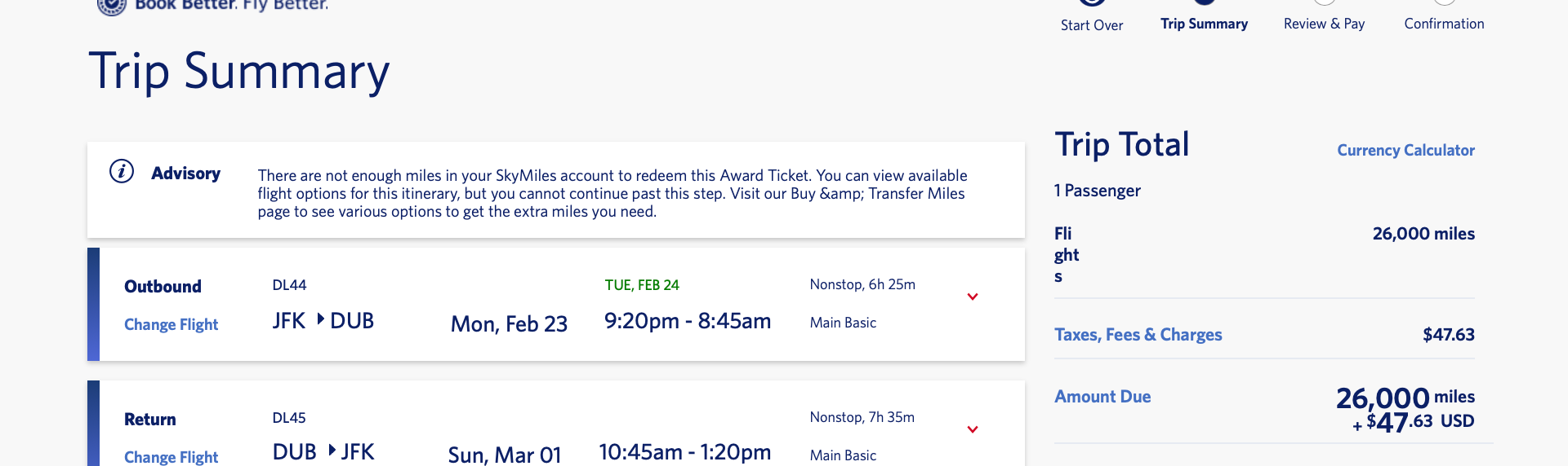 I know I said most of the lowest fares we found were for flights with layovers, but we did find a great nonstop deal to Dublin in late February out of New York. You can book this itinerary out of John F. Kennedy International Airport (JFK) to Dublin Airport (DUB) for only 26,000 SkyMiles each way, plus about $50 in fees. I didn’t see many nonstop routes in this deal, so jump on this one before it’s gone.