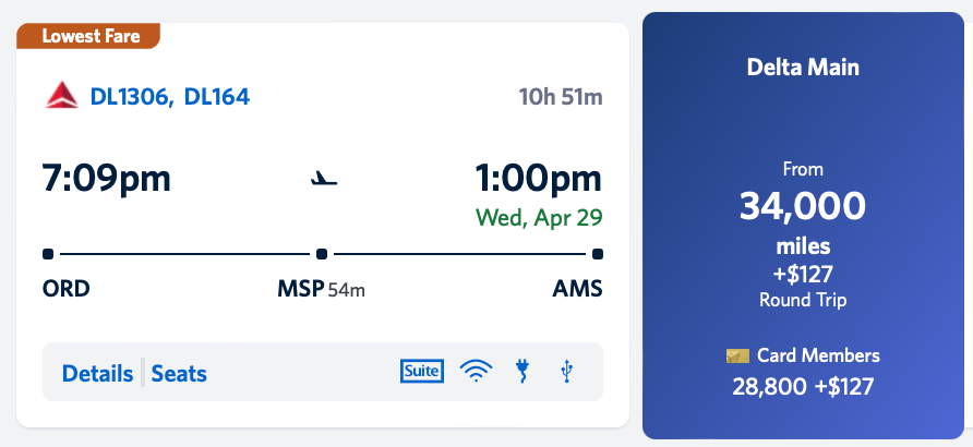 As I said, a lot of the best offers fly out of New York, with a smattering of other East Coast options. But Delta’s deals aren’t strictly confined to the Eastern Seaboard. If you live in Chicago, April flights to Amsterdam are a great option to explore in this sale. We found flights out of O’Hare International Airport (ORD) to Amsterdam Airport Schiphol (AMS) for 34,000 miles each way, plus $127 in taxes.