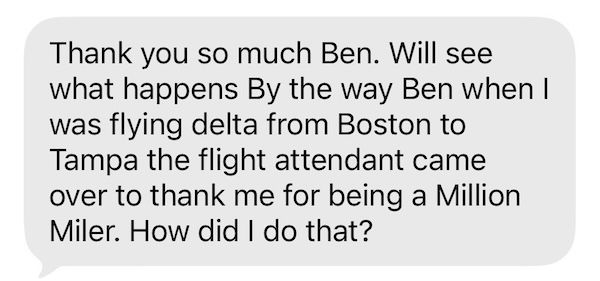 I’m just curious to see how many qualifying points he has over the course of his lifetime. It could be not that many, or it could be more than enough for lifetime Senator. Or it could be that his activity just didn’t track correctly, due to how long ago it was? Funny enough, my dad has million miler status with Delta SkyMiles, despite not having flown the airline much at all in the past 30 or so years. He really only learned about this on a recent flight, when he messaged me the below.