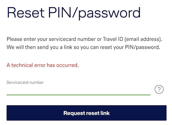 The email contained his 15-digit “service card number,” and the email encouraged him to log into his account with that and his five-digit PIN. There was also a link to reset the PIN, which we followed. However, after entering the account number, the message said “a technical error has occurred.” I tried a different browser, tried clearing cookies, etc., and no matter what I did, the same thing happened.
