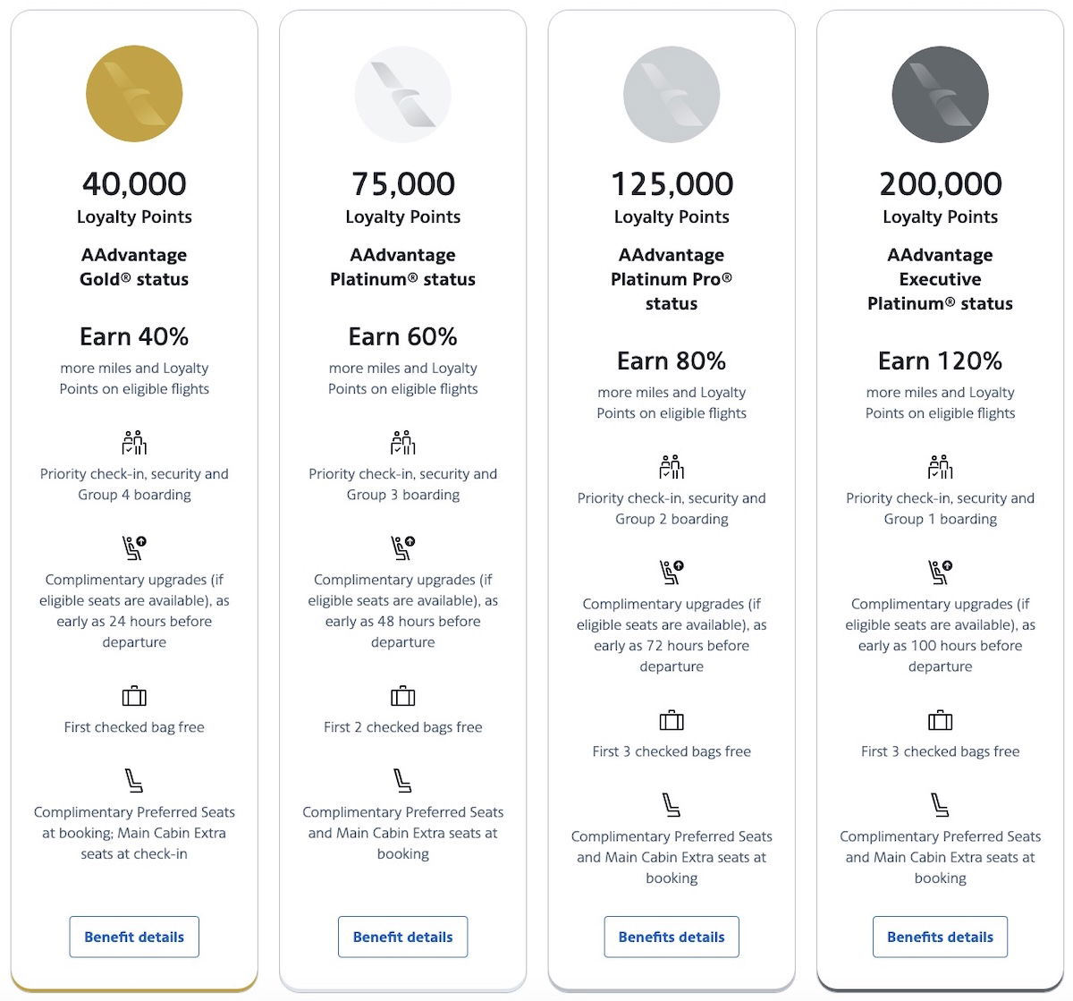 American AAdvantage elite status is earned exclusively based on how many Loyalty Points you rack up. Every qualifying AAdvantage mile accrued earns you one Loyalty Point. For the current program year, AAdvantage elite status requirements are as follows: