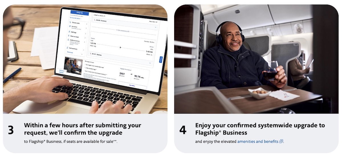 The way this works, you have to request a systemwide upgrade on the international flight either through American’s website, app, or call center. Within a few hours of submitting an upgrade request, American will confirm the upgrade to business class, assuming there are still seats for sale.