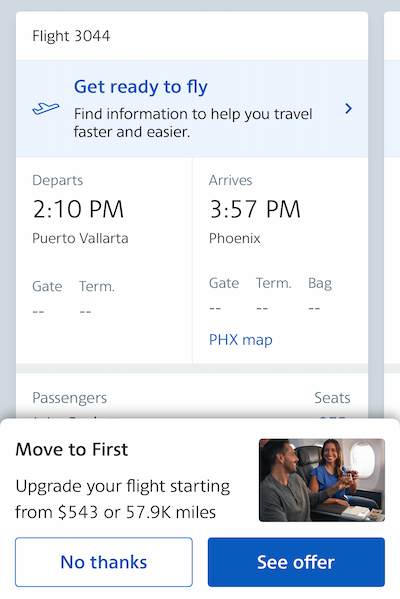 - You can log into the American Airlines app and open your itinerary; refresh the itinerary and then wait a few seconds, and you may see an upgrade offer pop up at the bottom of the screen, where it will say “Move to First/Business”