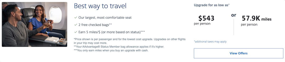 Before discussing the general value of American’s instant upgrade program, let me mention that you can always either pay for these upgrades with cash or miles. Personally, I’d almost never consider this to be a good use of AAdvantage miles.