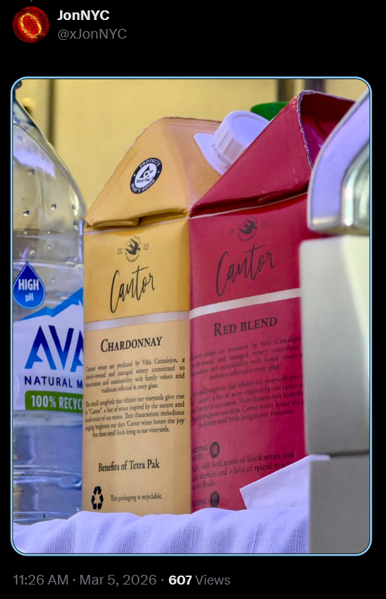 “Currently on AA142 to LHR in J. Pre ordered meals honored but wine is boxed wine and bollinger is Cava. I couldn’t believe it when I saw boxes wine on the cart.”— JonNYC (@xJonNYC) March 5, 2026
