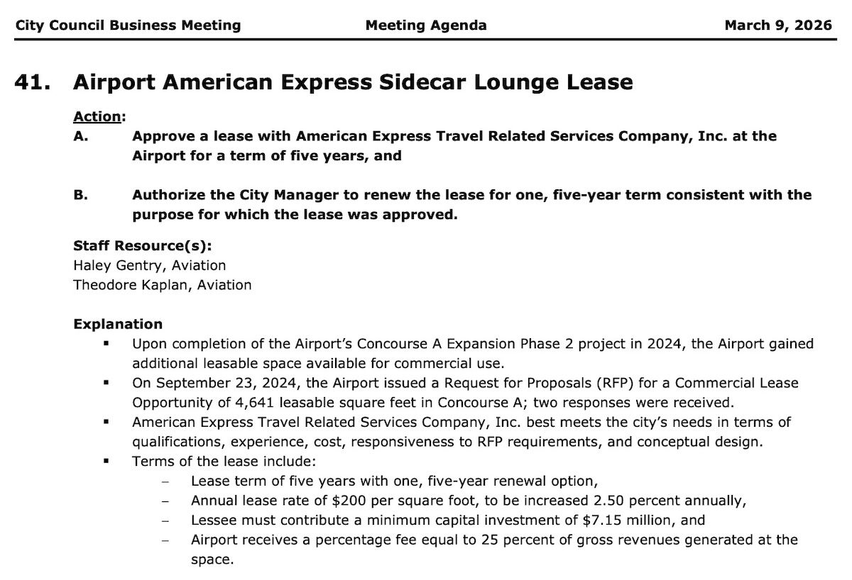 If this gets approved (and I see no reason it wouldn’t be), there will be a new 4,641 square foot Sidecar by Centurion Lounge in the airport’s Concourse A, as part of the second phase of the expansion. Amex is agreeing to a lease of five years, which can be extended by an additional five years.