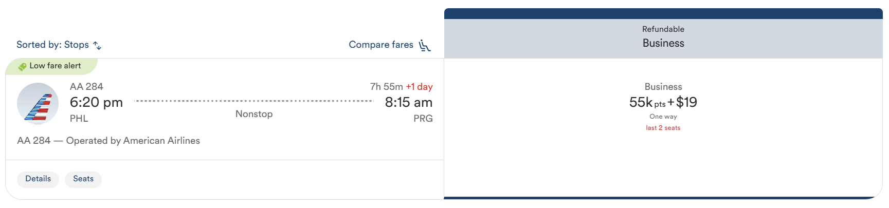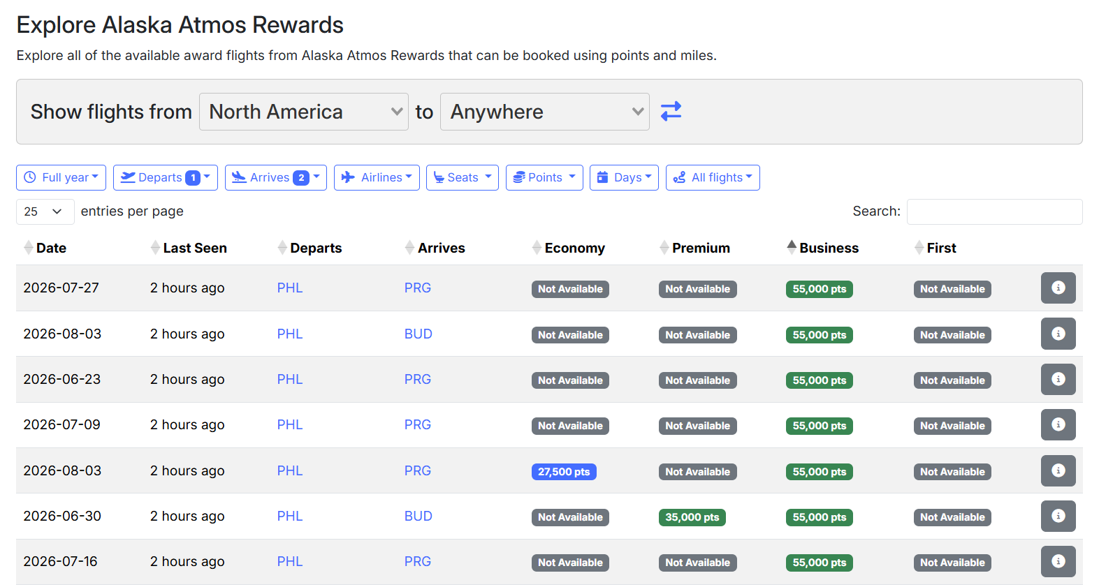 Right now, Alaska Airlines’ Atmos Rewards program has nonstop flights from Philadelphia to Prague and Budapest for just 55,000 Atmos Rewards points and minimal taxes and fees one-way in business class. There are also some premium economy seats on the same flight for 35,000 points.