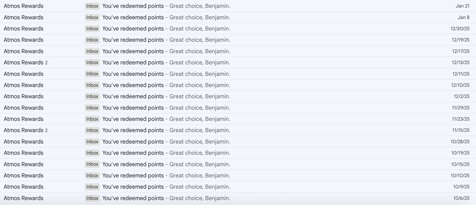 Just as an example, below are the reservations confirmations I’ve received from Atmos Rewards in the last few months alone. That’s a total of 20 confirmations, and it includes a total of 34 one-way redemptions (since some trips are for multiple people). That’s $425 in waived partner award booking fees!