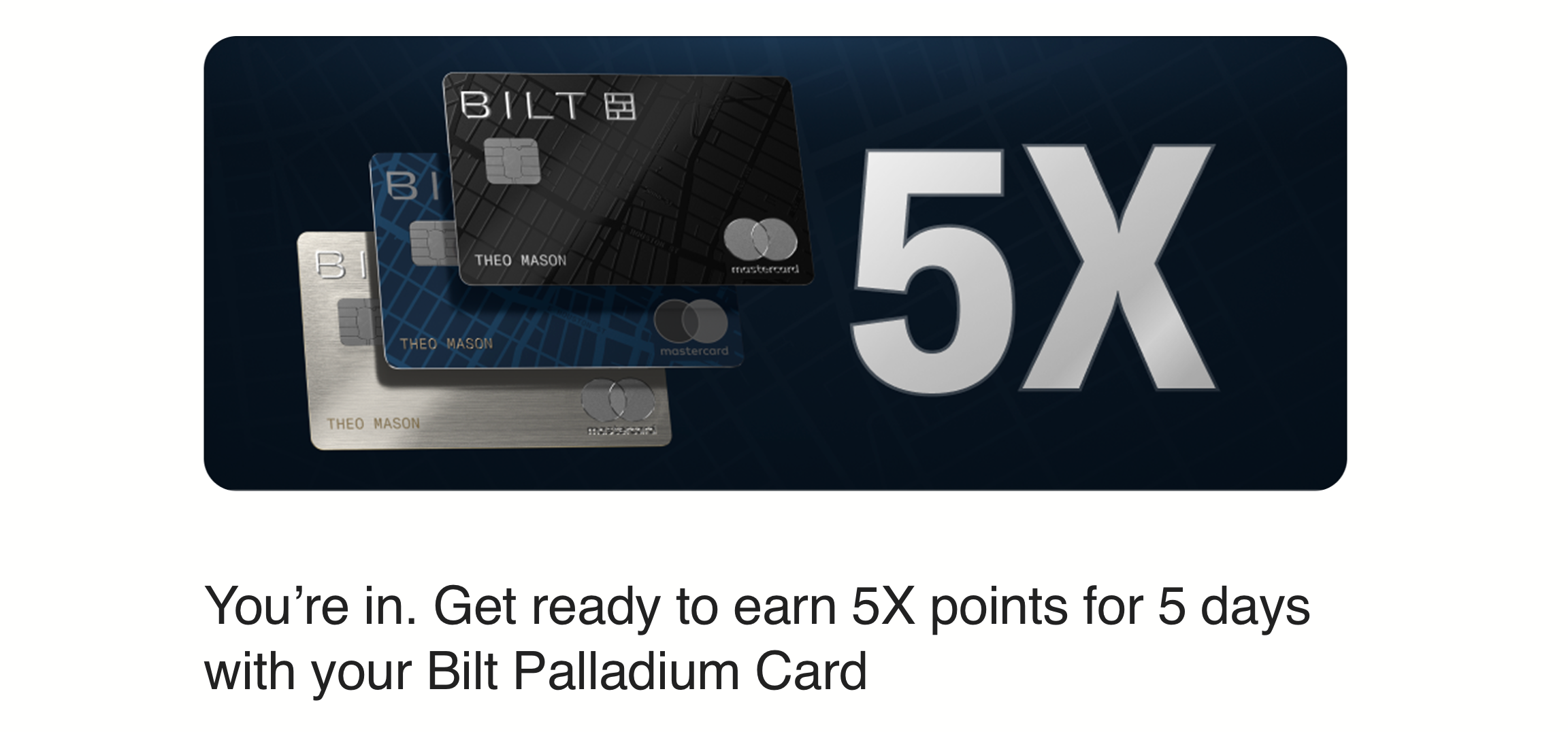 “Once the transition is complete, you can begin using your Bilt Palladium Card with Apple Pay, Google Pay, Samsung Wallet, and other mobile wallets on 2/7. To kick start your new rewards, you’ll earn an additional 3X on mobile wallet purchases through 2/10 (up to 500 Bilt Points).