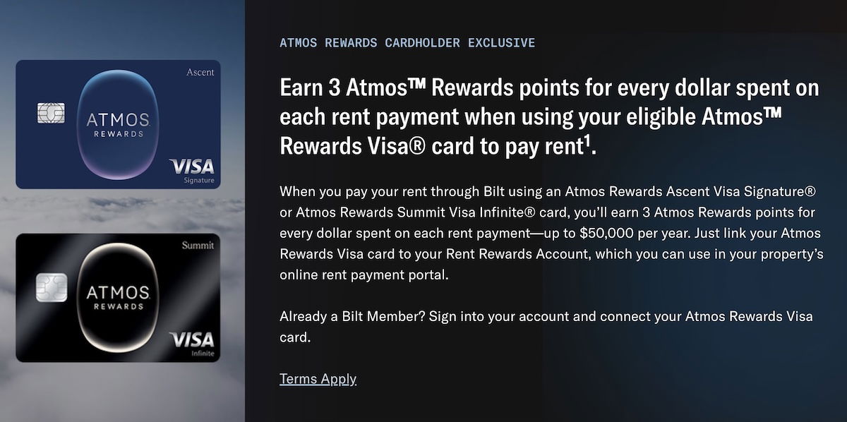 Bilt lets you pay rent with third party credit cards in exchange for a 3% fee. Typically that’s not worth it. However, thanks to the exclusive collaboration between the two brands, those with the Atmos™ Rewards Ascent Visa Signature® credit card (review) and Atmos™ Rewards Summit Visa Infinite® Credit Card (review) can earn points for paying their rent at an advantageous rate:
