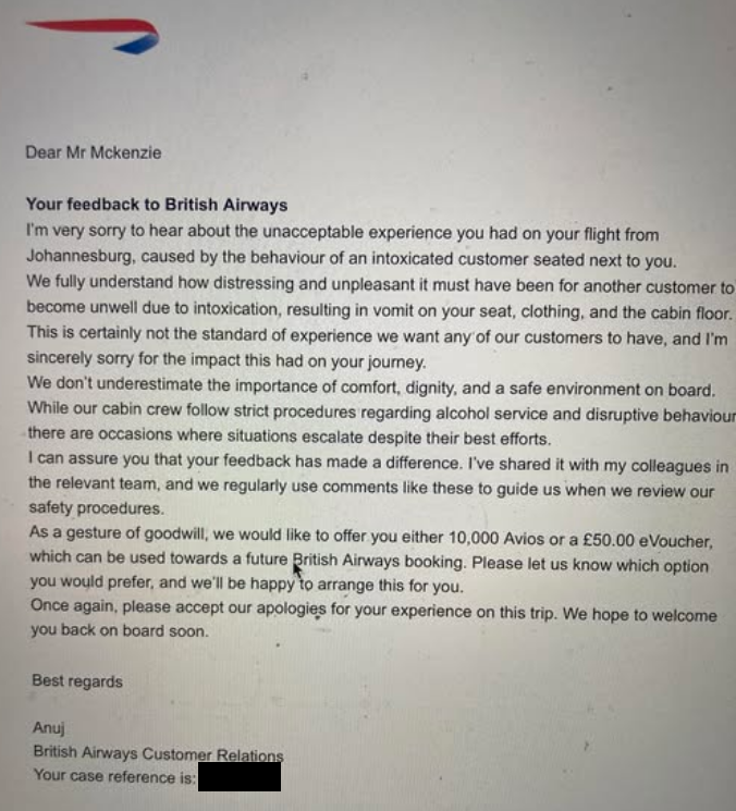 From the passenger’s perspective, flight attendants overserved the passenger so the airline is to blame. This isn’t random passenger misbehavior. In the British Airways view, the intoxicated passenger behaved badly and it’s not their fault – so a token apology that requires buying a future plane ticket is all that’s warranted. It’s “sorry this happened” not “we owe you.”