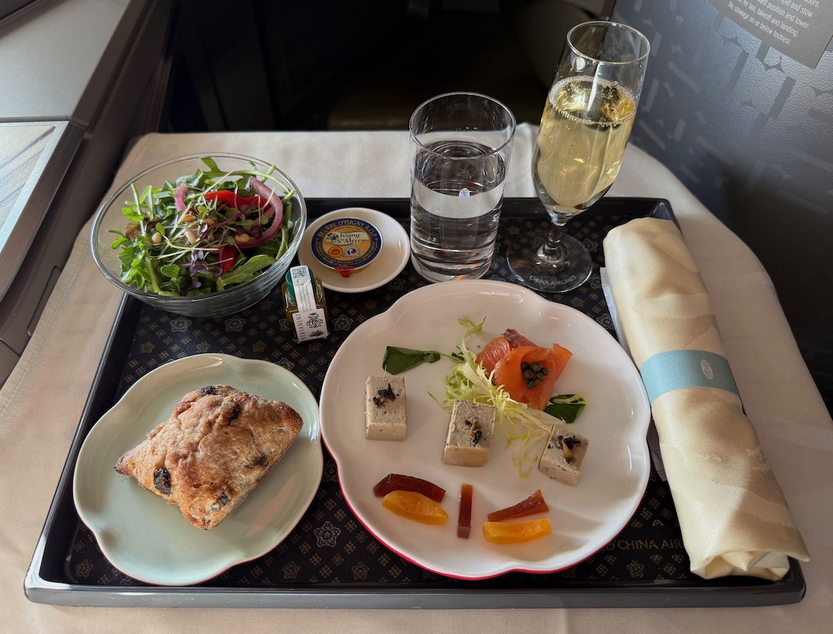 As is the case on all three Taiwanese airlines, the meals are absolutely massive. The first meal began with drinks, an amuse bouche, and two types of packaged snacks. I had a glass of champagne to drink, and China Airlines serves Laurent-Perrier Brut Millesime 2015 on US routes, which is pricey.