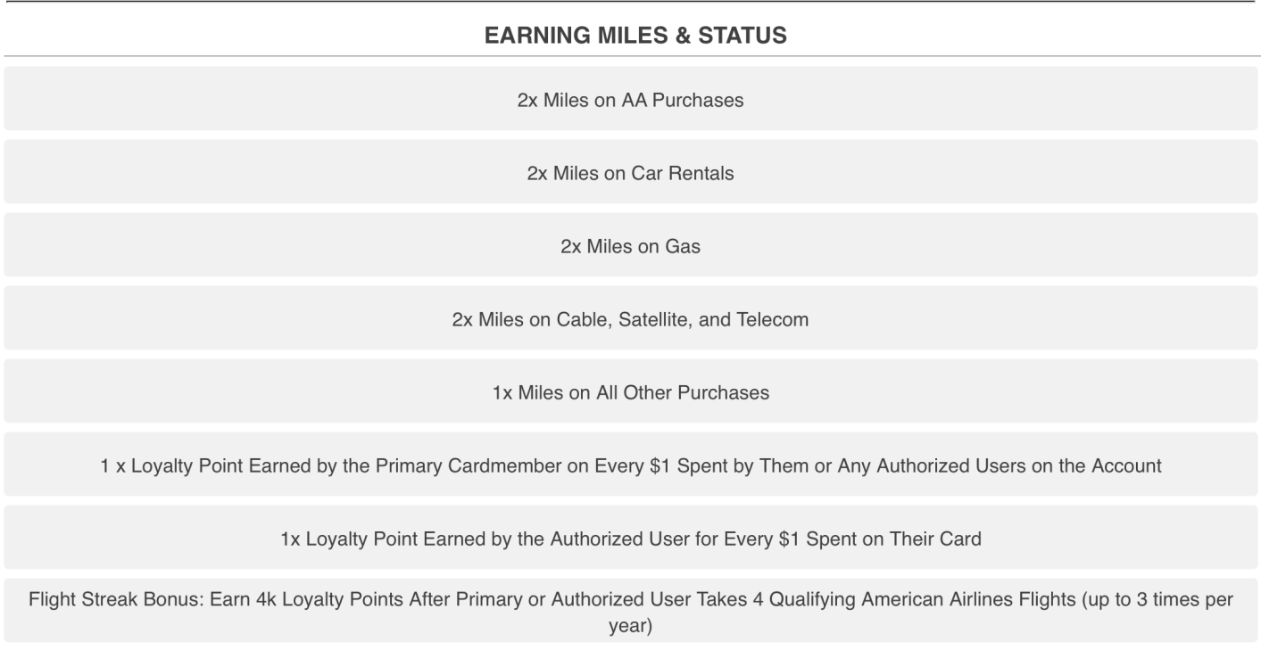 Earn in this example is 2x miles on American Airlines purchases, car rentals, gas, and cable/satellite/telecom and 1x on everything else. But the real benefit is that it earns one Loyalty Point towards status both for the primary cardmember and for the authorized user when the authorized user spends money.