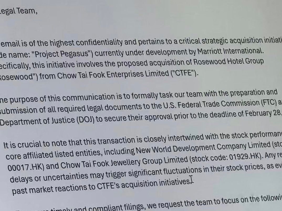 A FlyerTalk user shares what’s allegedly a leaked screenshot of a document for the legal team, which suggests that Marriott may be looking to acquire luxury hotel group Rosewood. While it’s only a partial screenshot, the text states that it “pertains to a critical strategic acquisition initiative” named “Project Pegasus” that’s “currently under development by Marriott International.”