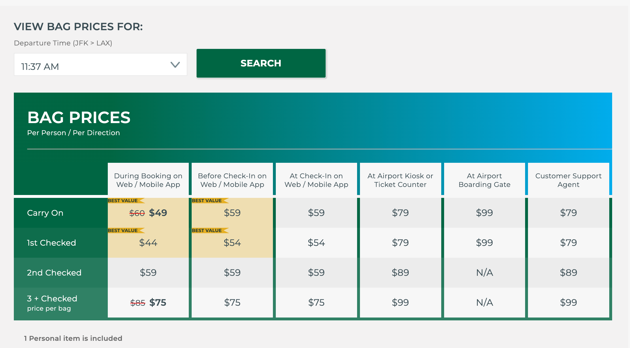 Here is an example of Frontier checked bag fees on a flight from New York’s John F. Kennedy International Airport (JFK) to Los Angeles International Airport (LAX) in early August, starting at $44 each: