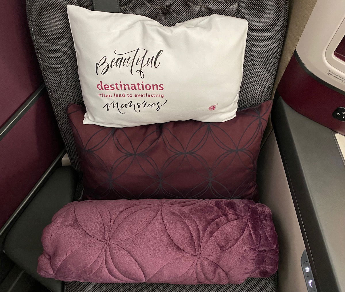 Now, I’m sort of convinced that they make the quotes on the pillows so cringe that you don’t actually want to take them with you, but that’s a different story. 😉 It’s funny, because I find Qatar Airways to be such an elegant airline, yet these pillows have strong “Live, Laugh, Love” vibes. I dunno, if you have a tween or teen daughter, maybe it makes for a good gift?