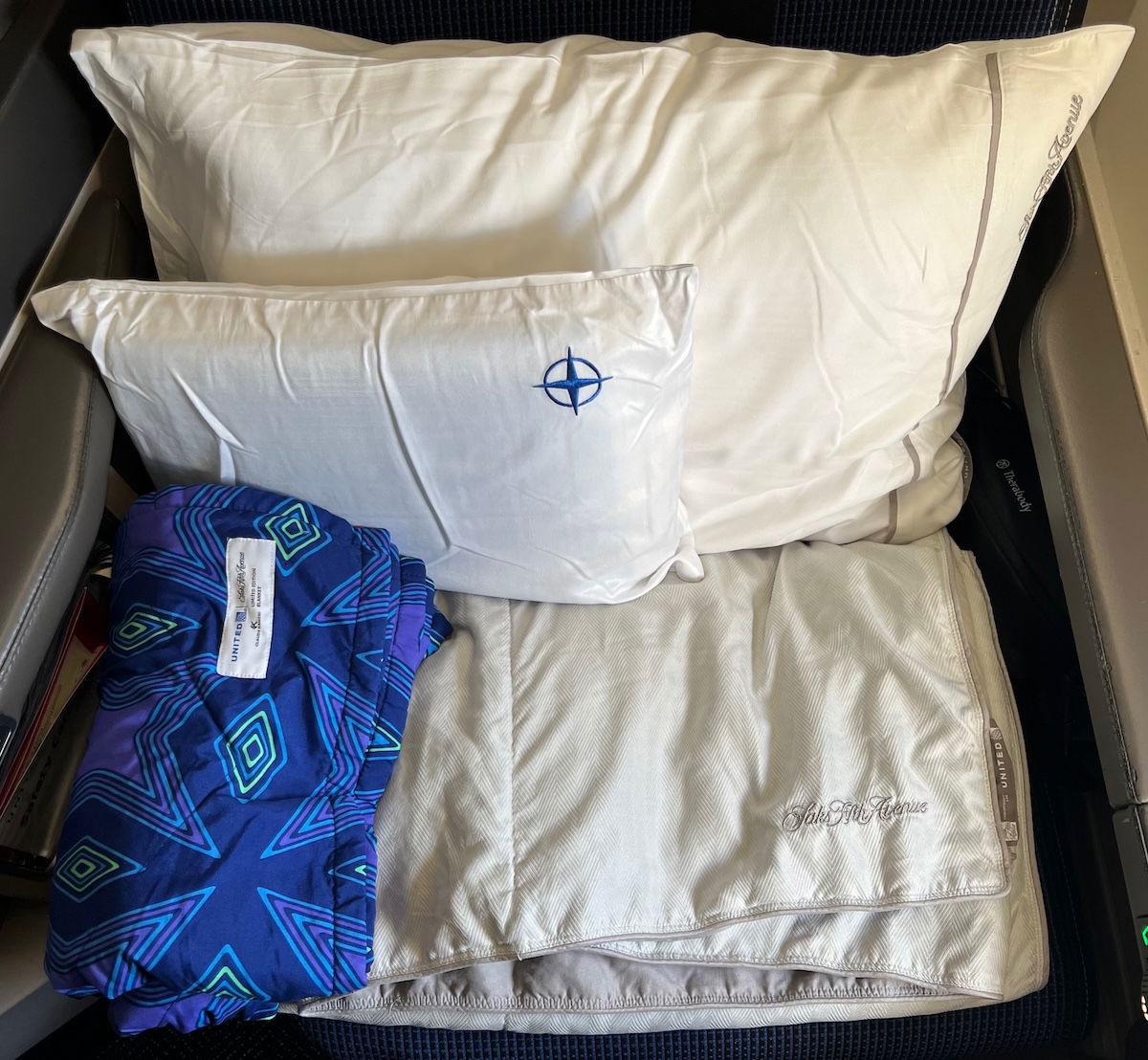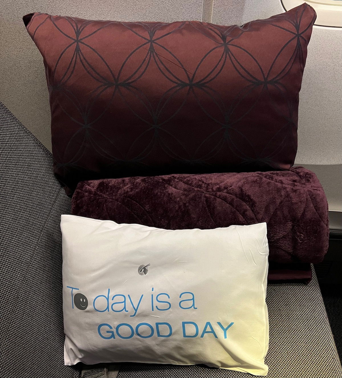 That pillow with a quote can be taken off the plane, as a memory and gift. It’s odd, because the airline doesn’t publicly promote this, but it is the official policy (at least last I heard), and if you ask a crew member, they’ll tell you that you can take them. In the interest of being thorough, let me mention that the other pillow and the blanket can’t be taken.
