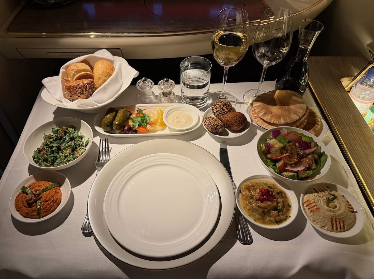 For example, typically I’ll start the flight by having some champagne with nuts, chips, and/or olives. Then I’ll typically go for the caviar, and then maybe the Arabic mezze (I have the caviar and mezze on every Emirates flight). But at that point I’m typically already so full, and can’t stomach the thought of having a soup, salad, main course, dessert, cheese, etc.