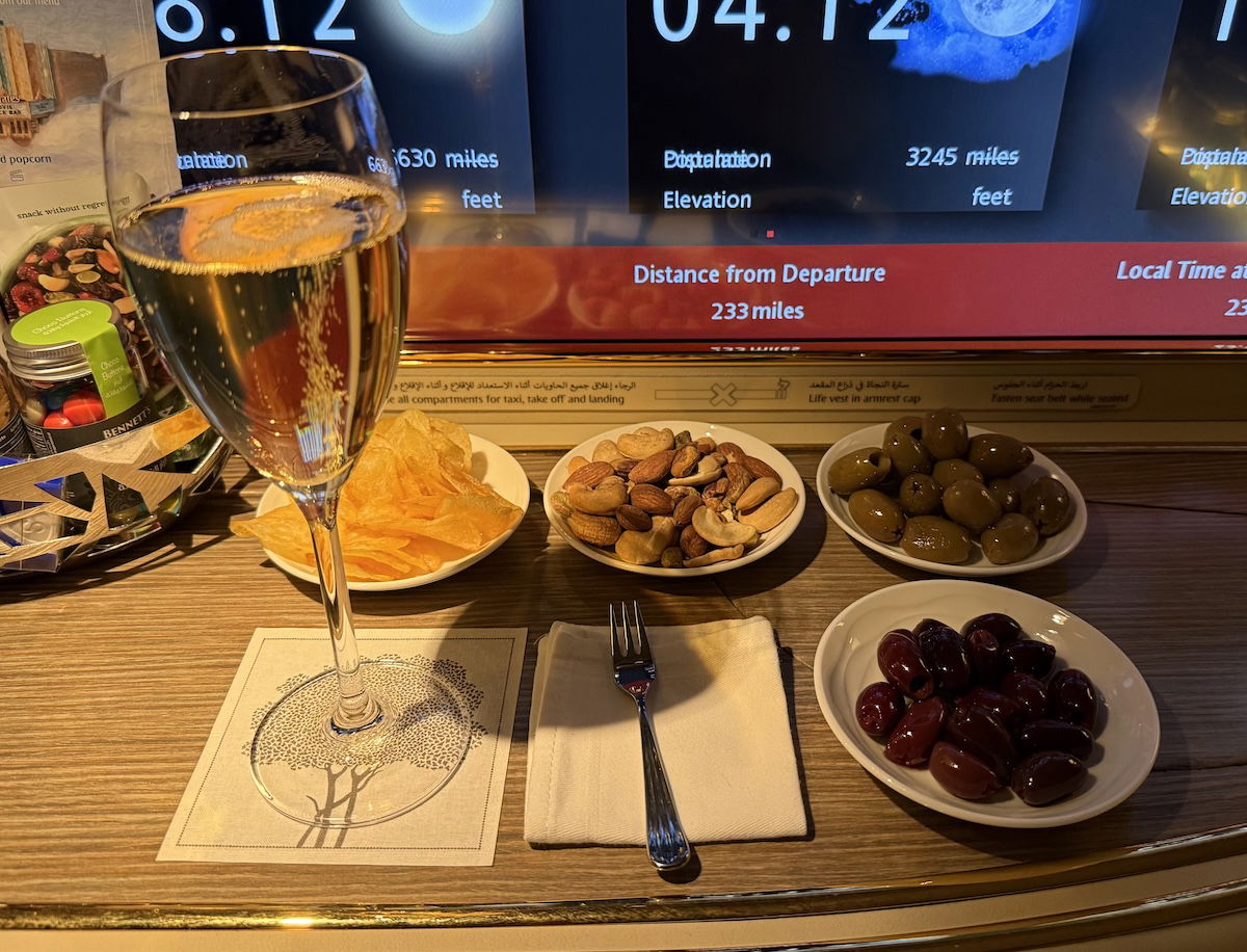 There are just so many cute little touches to Emirates’ first class meal service. For example, I love how with drinks, you can always order nuts, olives, and/or chips.