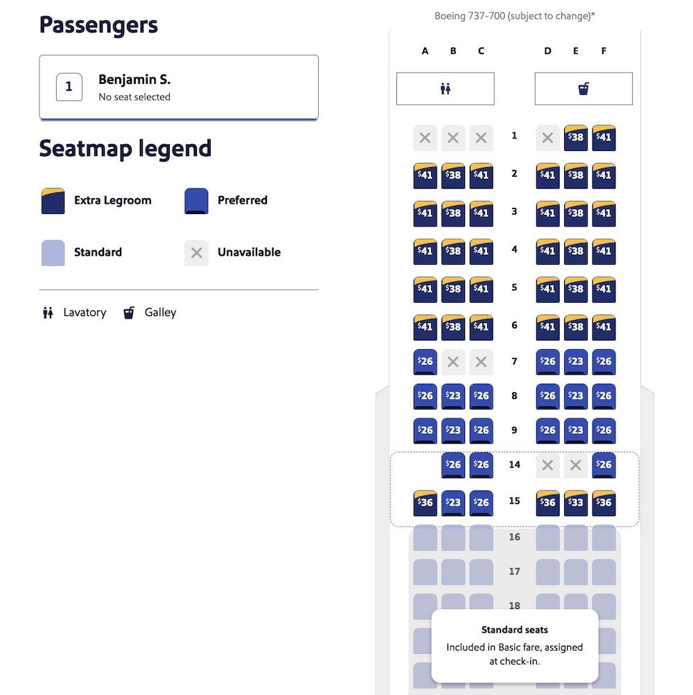 When booking the cheapest basic fare, seat assignments are only offered at check-in. Interestingly, you can’t even pay for a standard seat, but you can pay for a premium seat. The preferred seats range in cost from $23-26, while the extra legroom seats range in cost from $38-41.