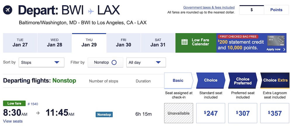 I then pulled up a flight from Baltimore (BWI) to Los Angeles (LAX), which is one of the carrier’s longer routes.