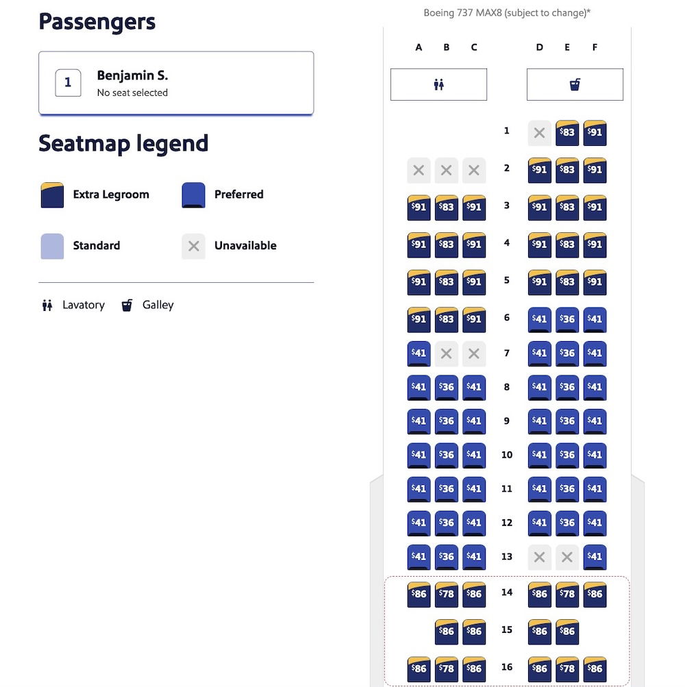 As you can tell, this pricing is dynamic, and will vary over time, I imagine. The thing that initially stands out to me the most is how little the pricing differs within each section, and between aisle seats and middle seats. I imagine that will change over time, to reflect consumer behavior.