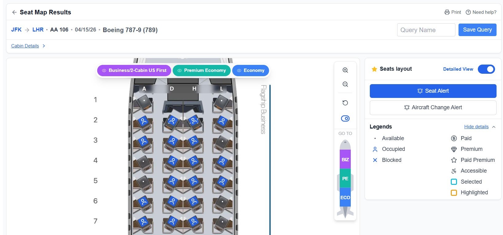Premium and Elite ExpertFlyer users can now see detailed seat maps when setting seat alerts and viewing seat maps. This is important because some airlines operate multiple versions of the same aircraft type (such as American Airlines’ 787-9, which may feature the new Flagship Suite or the older Super Diamond seats in business class).