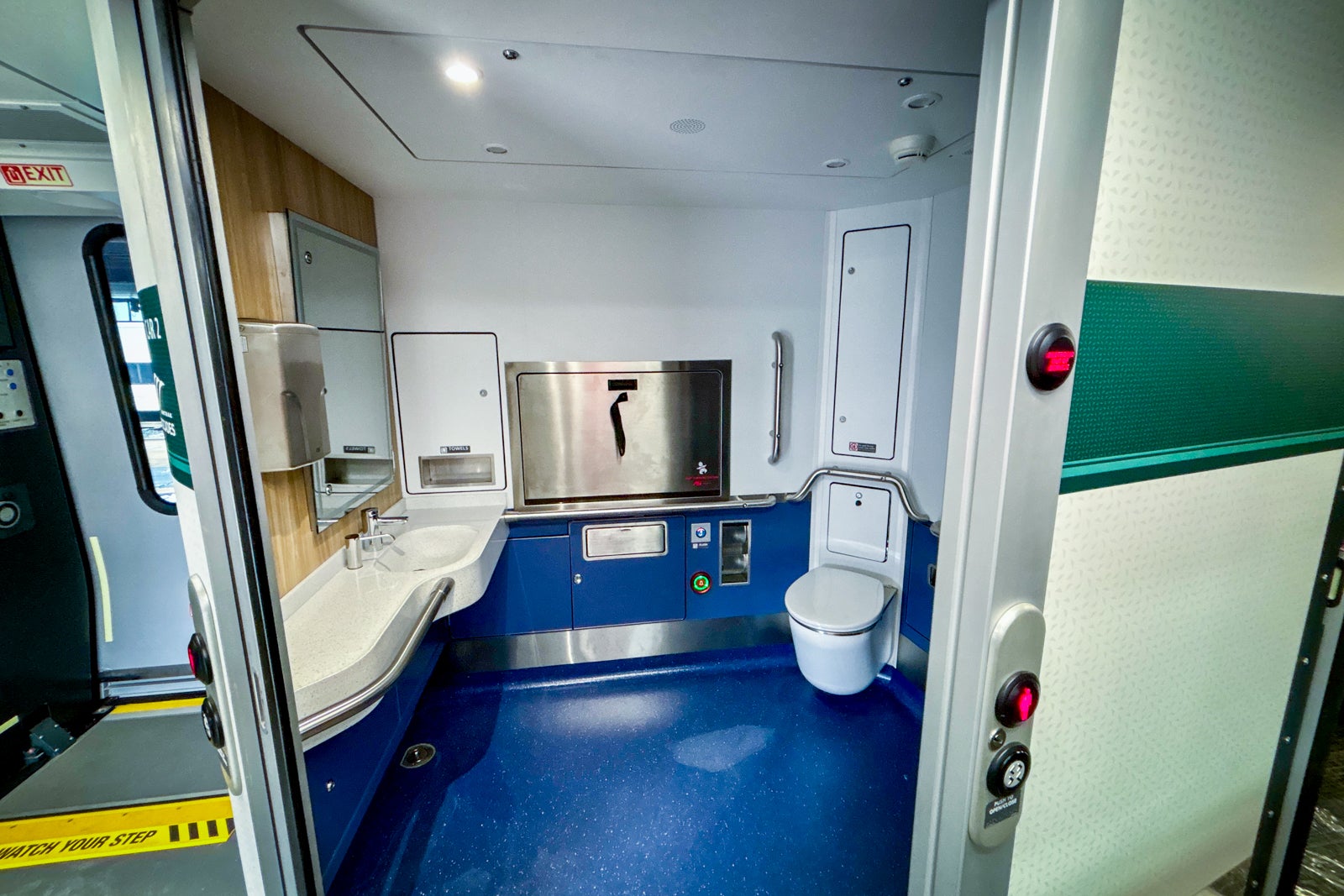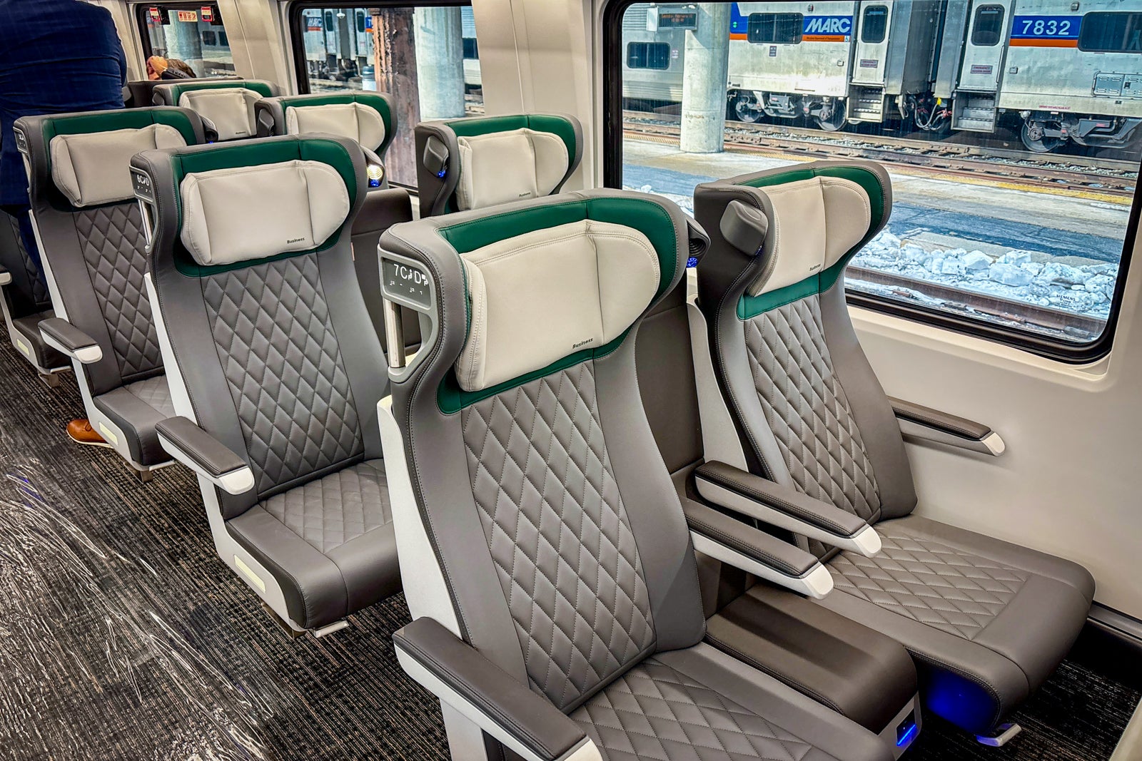 Unfortunately, rather than recline, the bottom of the seats slide forward similar to those on the NextGen Acela trains. This results in less legroom when “reclined,” and some taller travelers may find it uncomfortable.