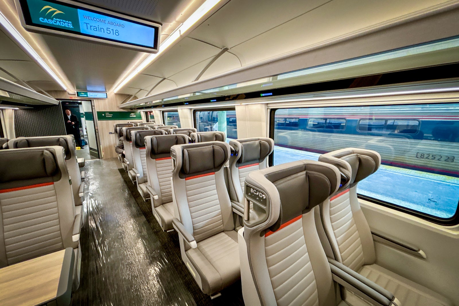 The new Cascades Airo trains have three dedicated cars of coach class seating plus some seats in the cafe car and cab car. Seats are laid out in Amtrak’s standard 2-2 coach configuration with several tables of four seats located in each car.