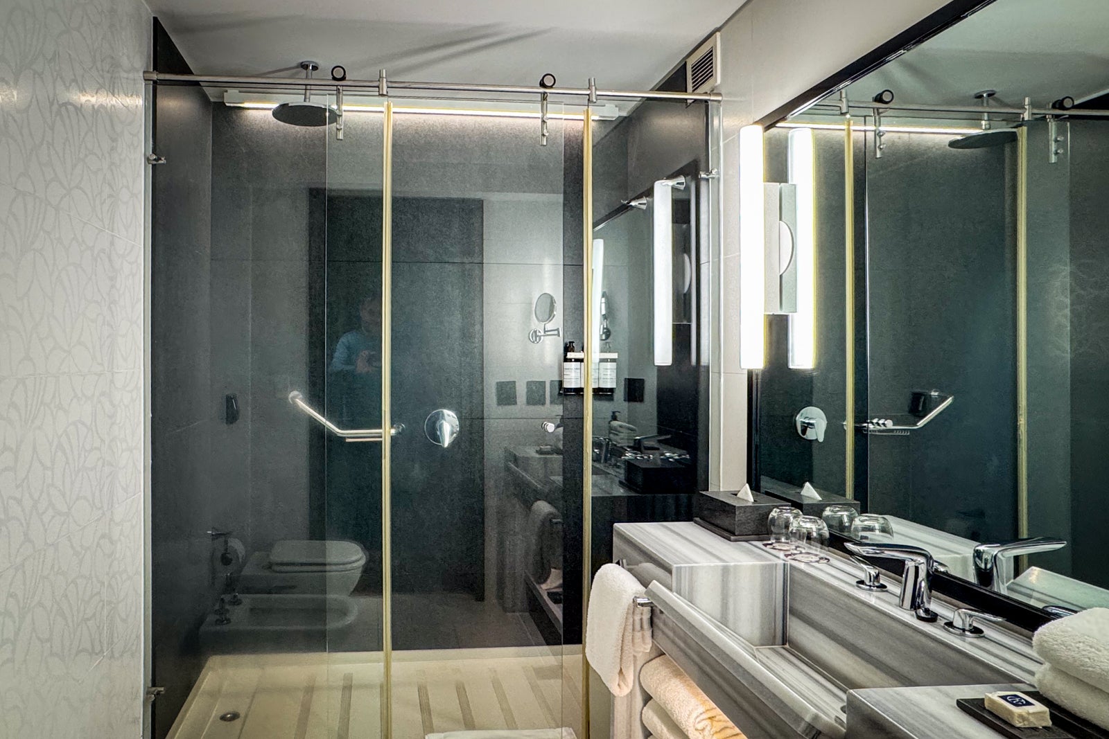 In the new rooms, bathrooms are tiled in black stone with frosted-glass walk-in showers and basin-style sinks, while older ones have gray marble counters with sunken sinks and walk-in showers. All offer verbena-scented bath and body products made locally.
