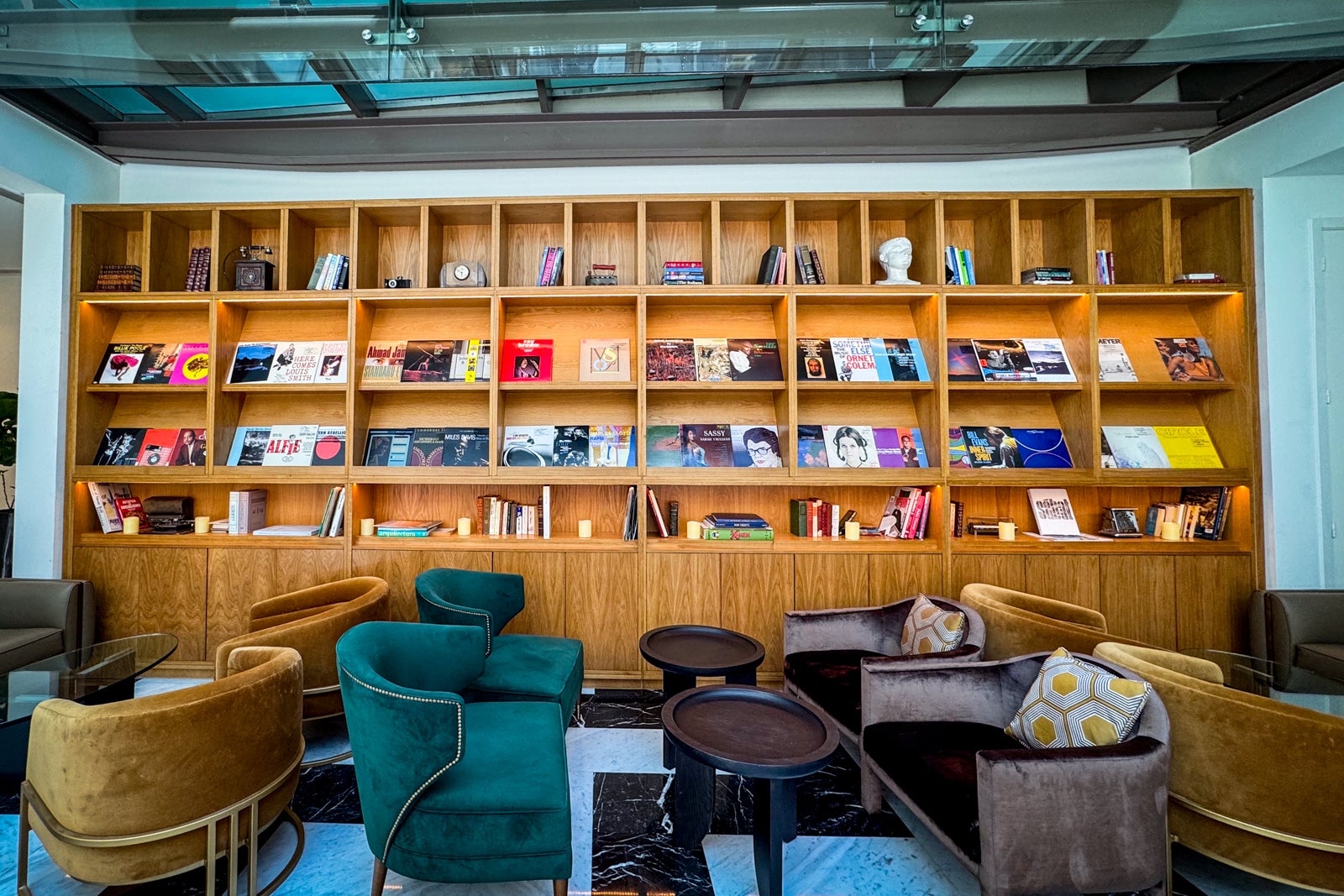 Invite some friends, then get cozy in one of the seating vignettes or at the tall marble counter as you settle in to discuss Buenos Aires’ literary legacy or thumb through one of the many vinyl albums and art books displayed on the dramatic coffered shelves.