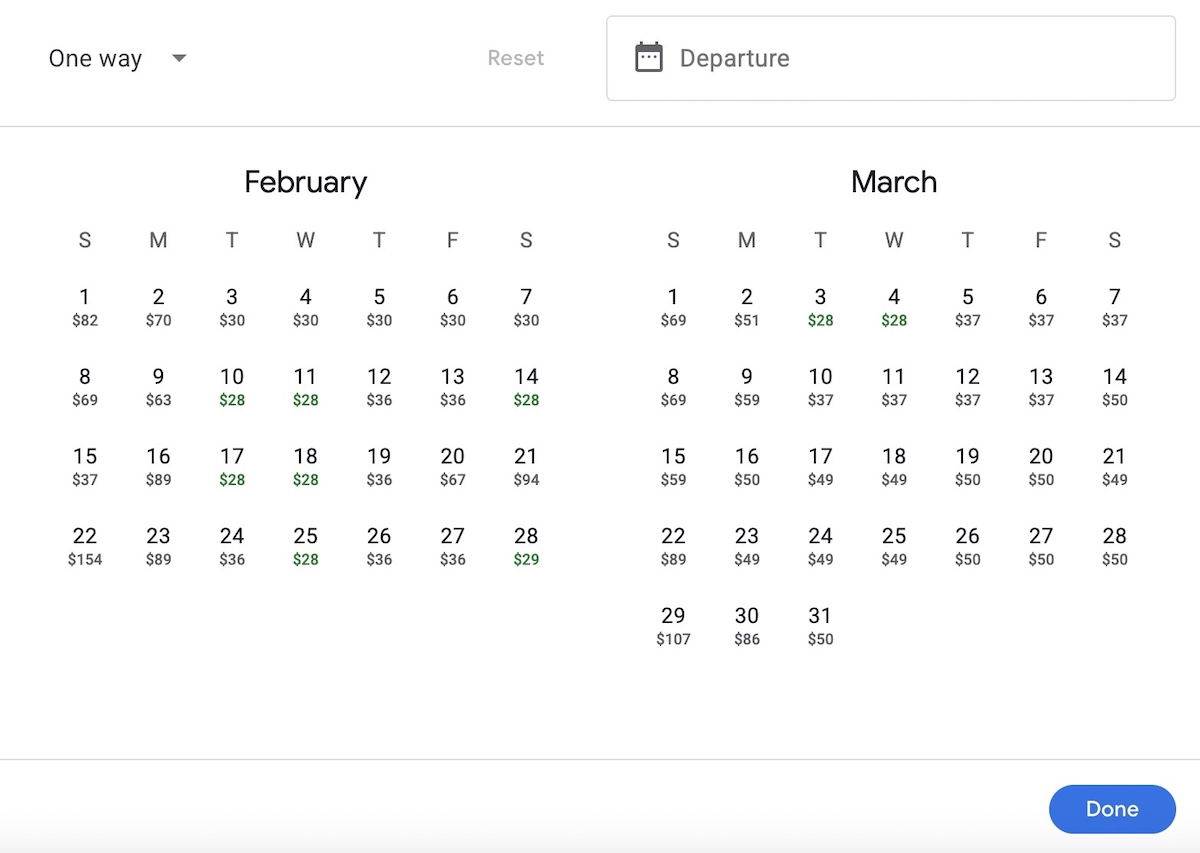 The first thing that makes Google Flights awesome is that when you get to the results page, you’ll immediately see a pricing calendar that shows you options for two months at a time. You can search an entire year of pricing in a given market in less than a minute.