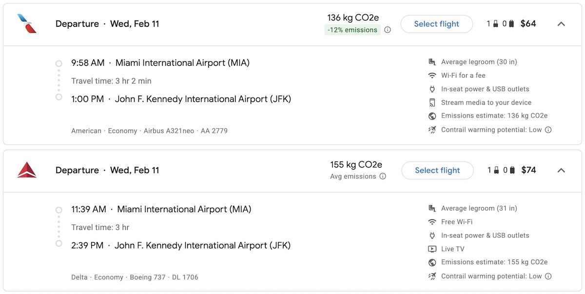 Google Flights also provides all kinds of useful details about flight amenities, from legroom, to the availability of Wi-Fi, to the type of business class seat you’ll get.