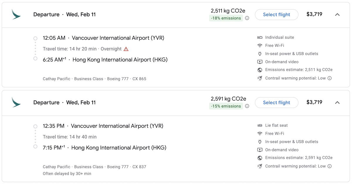In some cases this information is really useful. For example, if you’re curious if your Cathay Pacific flight will feature the new Aria Suite product, Google Flights shows flights with the Aria Suite as featuring an “individual suite,” while flights without the Aria Suite are shown as featuring a “lie flat seat.”
