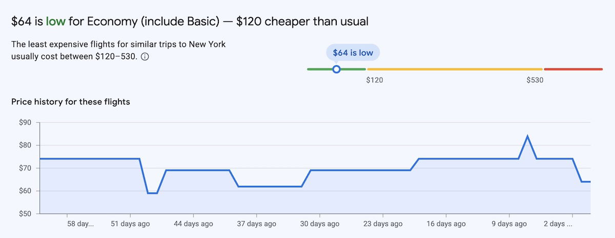 When you select a flight, Google Flights will tell you if your fare is typical, cheap, or expensive, based on historical data. You can make of that what you will, since obviously there are a lot of factors that go into airline pricing. In other words, just because a fare is marked as expensive, doesn’t necessarily mean it’s going to get any cheaper.