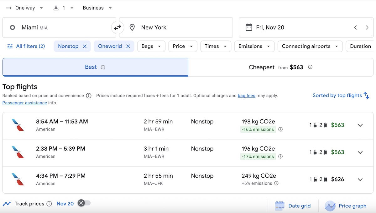 For example, say you’re looking at a particular flight from Miami to New York on American many months in advance, and the first class fare is currently more than you want to say. If you were interested in keeping an eye on one of these flights, just click the little “Track prices” button, and you’ll receive an email if the price of the flight changes.