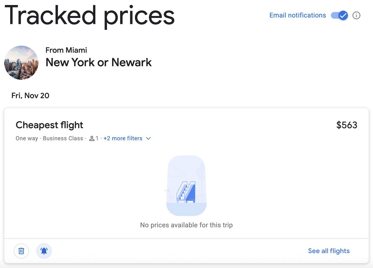 You can request price tracking for one particular flight, or for an entire day of availability between two city pairs, based on your parameters. You can set as many alerts as you’d like.