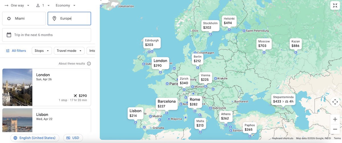 For example, you could enter Miami as your origin, and the entire country of Germany, or the entire continent of Europe, as your destination. You’ll then be presented with a map that shows you all the possibilities.