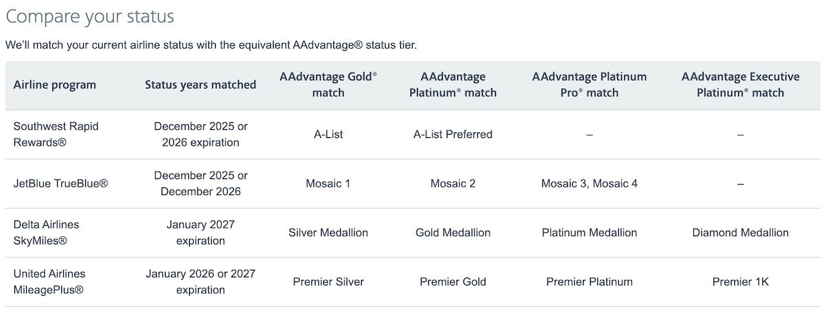 How does status with other airlines map over? Currently American is offering Instant Status Pass challenges to Delta SkyMiles, JetBlue TrueBlue, Southwest Rapid Rewards, and United MileagePlus elite members, and status maps over per the below chart.