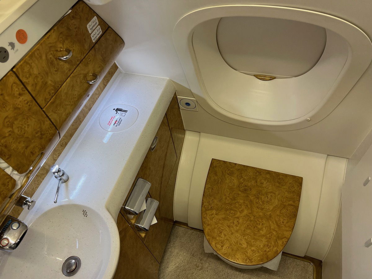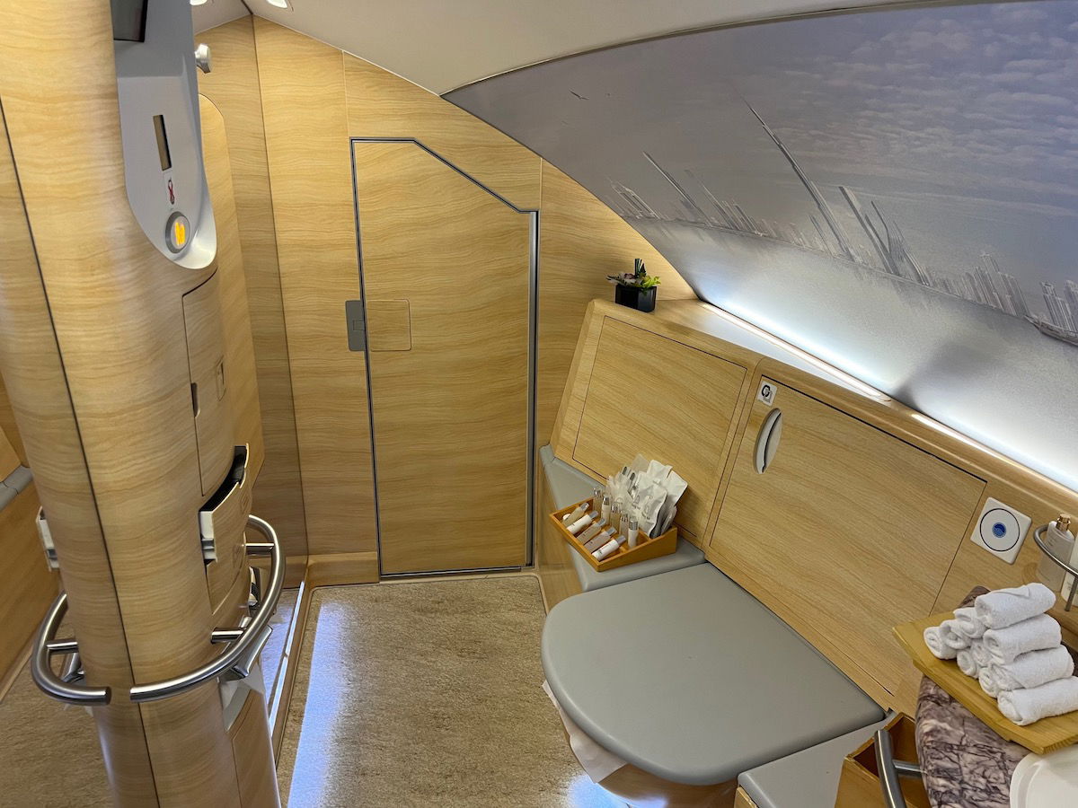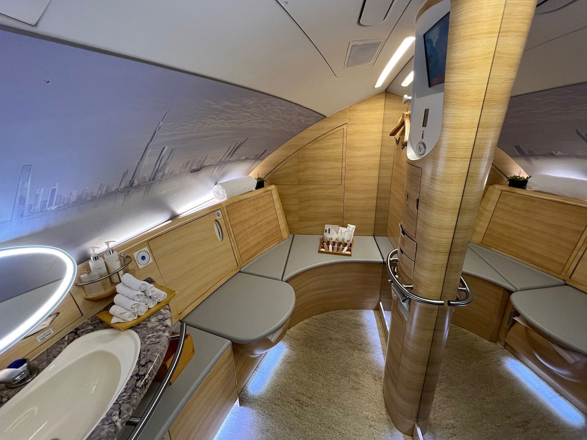 Yes, when the shower suites aren’t in use, they absolutely can be used as bathrooms as well. Emirates has three bathrooms in A380 first class, including the two shower suites at the front of the cabin, plus there’s a smaller bathroom behind the cabin.