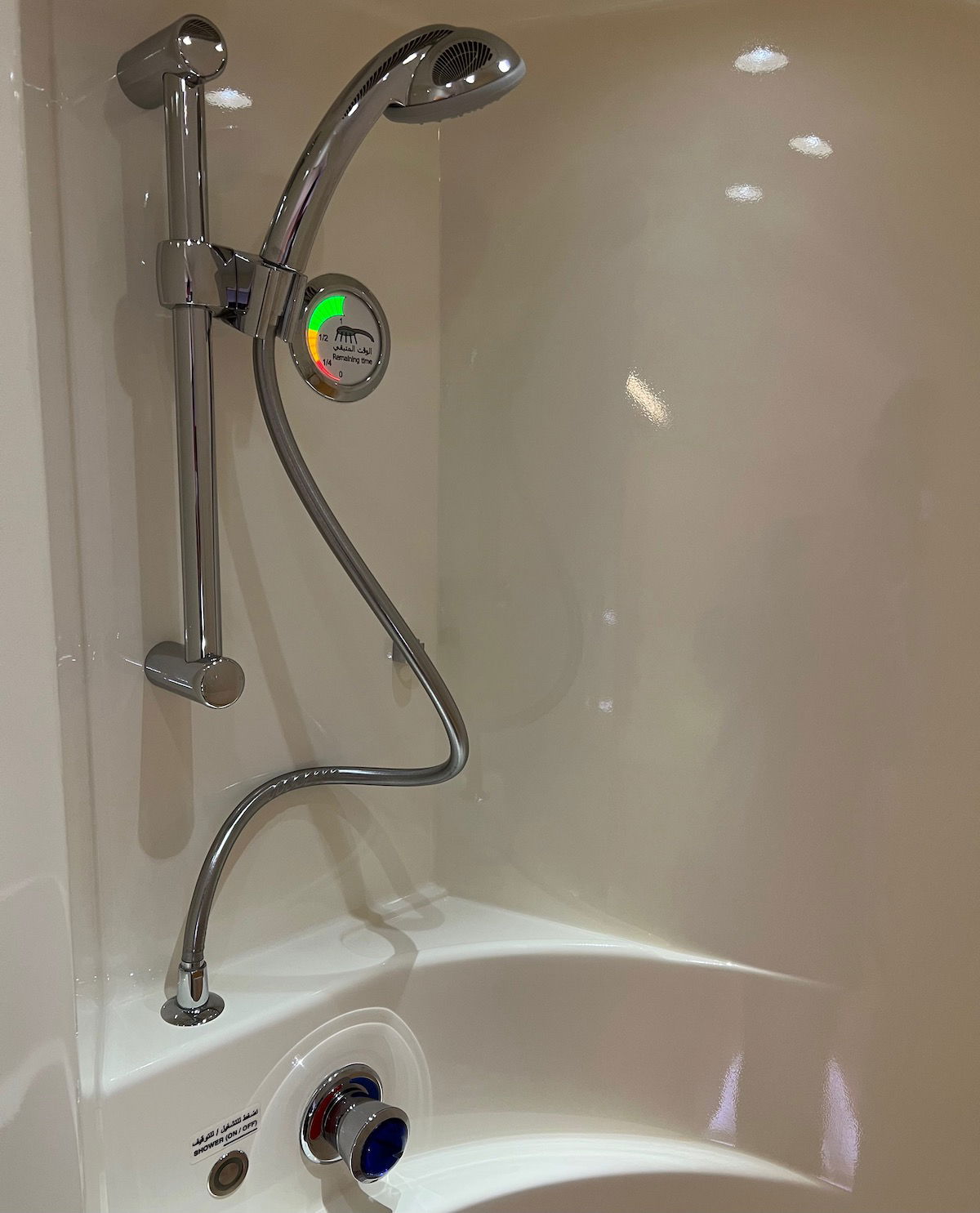 The shower has a timer that shows how much of your five minute water allotment is remaining. For half the shower you should be in the green zone, then the other half of the shower time is split between yellow and red. When your shower gets into the red zone, it will automatically turn off as a warning, and you’ll have to push the button to turn it back on.