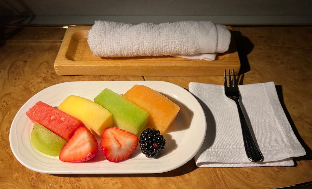 As a standard offering, Emirates places a small fruit plate at your seat after a shower, and also offers you green tea, if you’d like. This is intended to further create a spa-like experience.