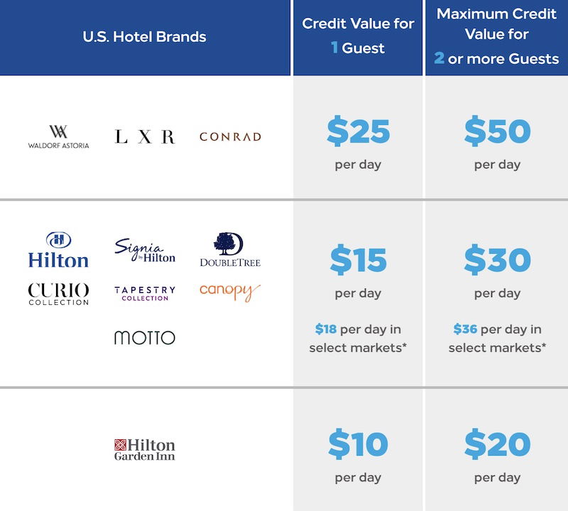 The amount of the credit ranges from $10-25 per person per night, and depends on the brand and location. For full service and lifestyle brands, high-cost markets include Boston, Chicago, the District of Columbia, Key Largo, Key West, New York City, San Francisco, the county of Los Angeles, and the state of Hawaii.